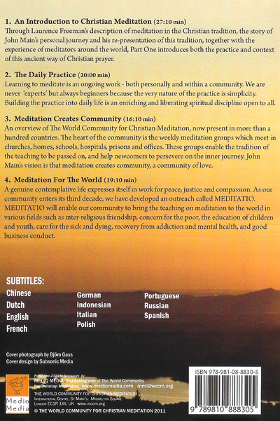 This DVD introduces the way of Christian meditation, and the work and vision of The World Community for Christian Meditation (WCCM) in four parts. In the first part, Laurence Freeman describes the Christian tradition of meditation and John Main's re-presentation of the tradition for modern-day seekers. Part two gives a teaching on how to meditate followed by the sharing of personal experiences by meditators around the world. Part three gives an overview of WCCM and the life of this global community. Part four presents Meditatio, WCCM’s outreach arm which expresses its contemplative life in work for peace, justice and compassion.