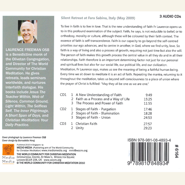 To live in faith is to live in love. That is the new understanding of faith Laurence Freeman opens us to in this profound examination of the subject. Faith, he says, is not reducible to belief, or to orthodoxy, morality, or culture, although these will be coloured by their faith context. The essence of faith is self-transcendence. Faith is our capacity to go beyond the self-centred priorities our ego advances, and to centre in another, in God, where we find unity, love. So faith is a way of living and also a process of growth, requiring not just time but also the will. The person of faith makes this growth process the central value in all they do and in all their relationships. Faith therefore is an important determining factor not just for our personal and spiritual lives but also for our social life, our political life, and our civilisation.