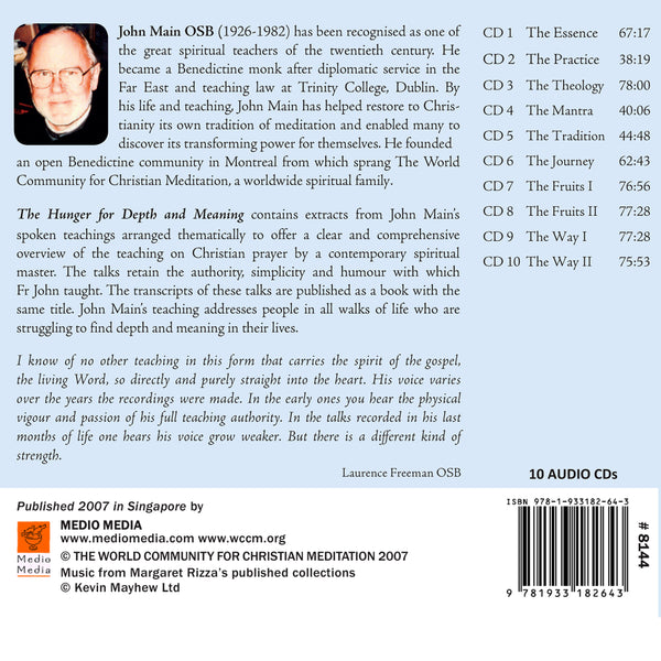 This set of ten CDs contains sixty-nine extracts from John Main’s spoken teachings arranged thematically in eight sections. The talks offer a clear and comprehensive overview of the teaching on Christian prayer by a contemporary spiritual master. The authority, simplicity and humour with which John Main taught will touch the listener at a very deep level. His teaching addresses all people struggling with the pressures of modern-day living and seeking depth and meaning in their lives.