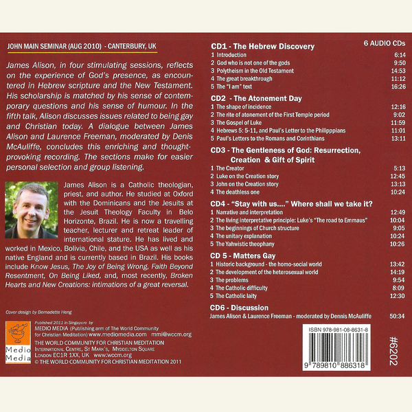 James Alison reflects on the experience of God’s presence, as encountered in Hebrew scripture and the New Testament. His scholarship is matched by his deep understanding of contemporary questions and his sense of humour. Among the issues discussed are those related to being gay and Christian today. A stimulating dialogue between James Alison and Laurence Freeman concludes this enriching and thought-provoking recording. The talks are divided into sections to make for easier personal selection or group listening.
