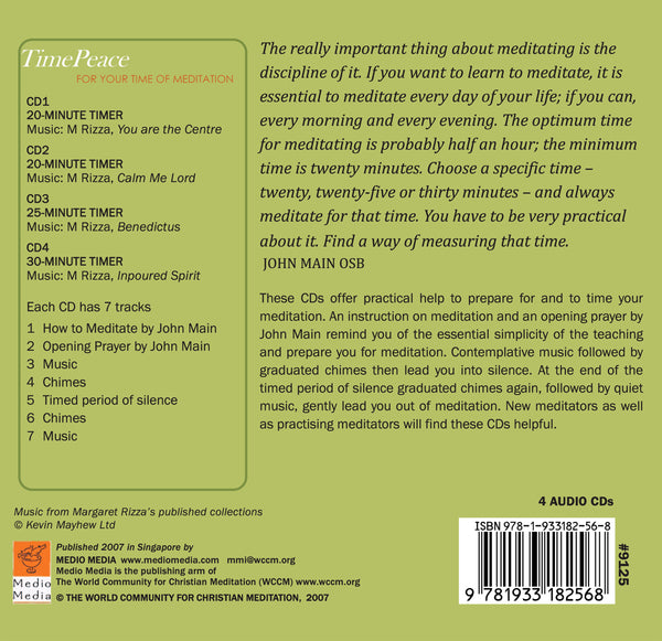 These audio CDs offer practical help to prepare for and to time your meditation. An instruction on meditation and an opening prayer by John Main remind you of the essential simplicity of the teaching and prepare you for the practice. Contemplative music followed by quiet chimes then lead you into silence. At the end of the timed period of silence chimes again, followed by music, gently lead you out of meditation. You have a choice of twenty, twenty-five, or thirty minutes of silence. All meditators, new or practising, will find these CDs helpful.