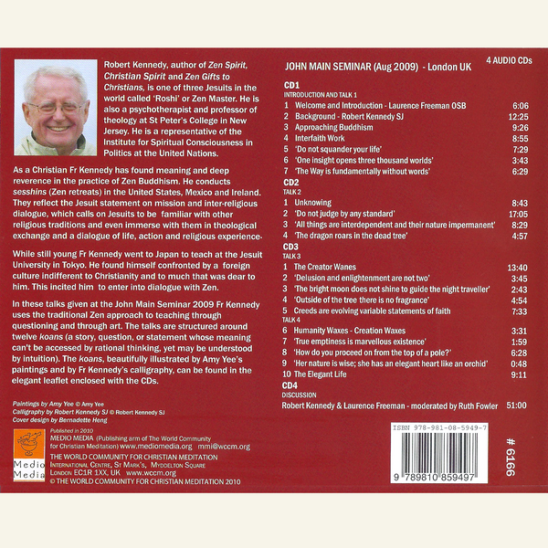In these talks Robert Kennedy uses the traditional Zen approach to teaching through questioning and through art. The talks are structured around twelve koans (a story, question, or statement whose meaning can't be accessed by rational thinking, yet may be understood by intuition). The koans, elegantly illustrated with Amy Yee’s paintings and Robert Kennedy’s calligraphy, can be found in the leaflet enclosed with these CDs.